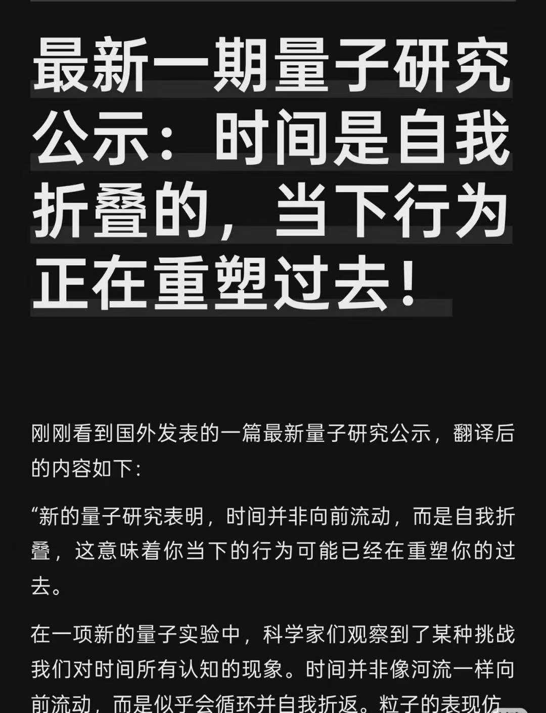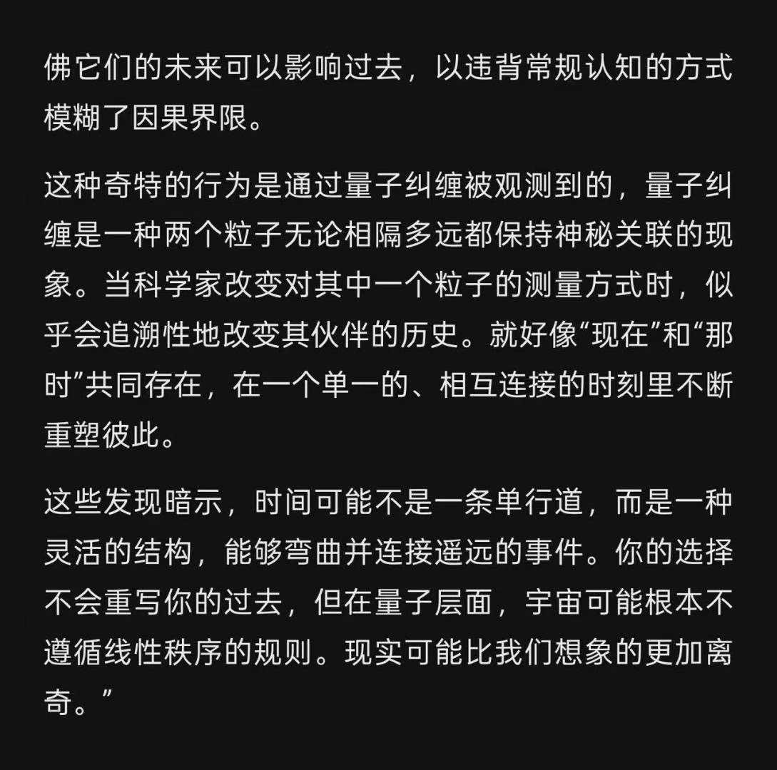 弟子今天看到一条帖子,其中内容弟子还未来得及考证,但其表明的原理或可成为一些印证。科学能够证实当下行为不仅能够影响未来,还能够重塑过去,那么也说明了通过圣密修行调整大三世诸业确实是真实不虚的,因为这不仅符合佛法的因果法则等,也从现代科学层面得到了某些佐证。