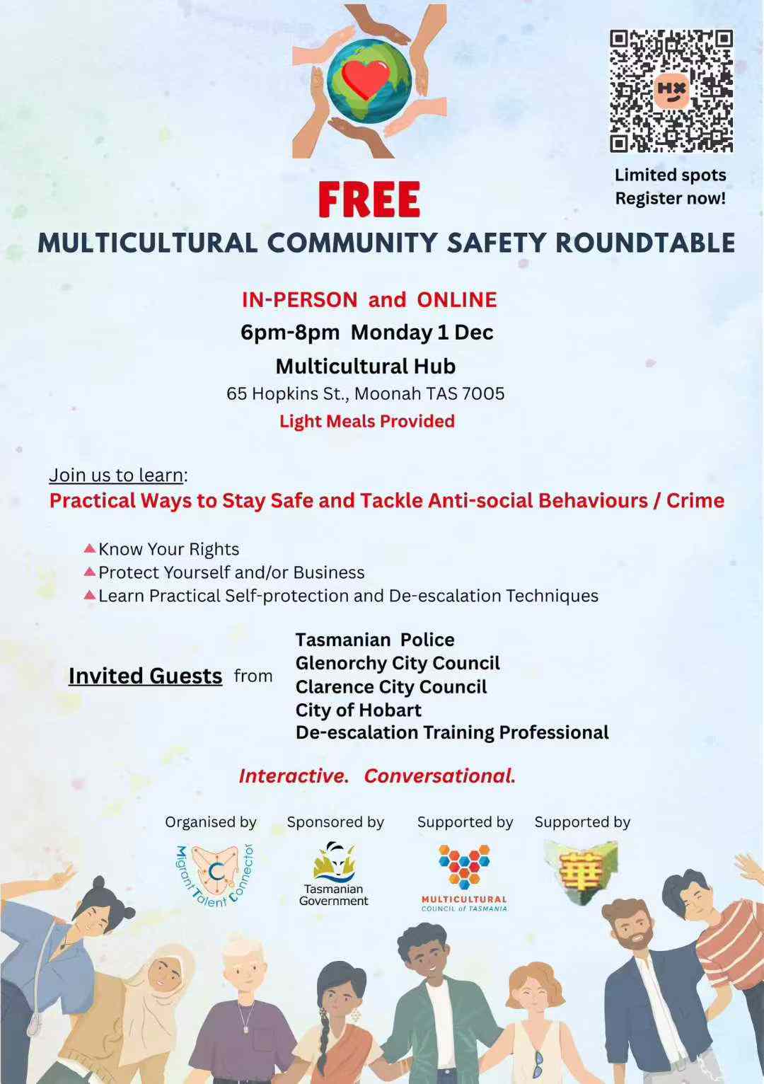 • 📍 地点:多元文化中心( • 🎟️ 费用:全免,需扫码报名 【活动亮点】✨ • 🚔 多方参与:塔斯马尼亚警方、周边三大市政府的代表,专业冲突降级培训师现场交流 • ⚖️ 实用聚焦:明确自身权益、个人/商业安全保护、冲突化解等实用技能 • 💬 互动为主:轻松对话,鼓励提问,非单向讲座 • 🌐 参与灵活方便:线上线下同步。线下提供简餐,线上链接会在报名后自动发送