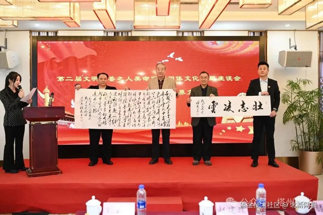值得一提的是,國家一級美術師、國務外交禮品師、中華國禮藝術家、國家民族畫院書法家,香港中國書法家協會常務副會長薛穩發會長因公無法親臨現場,但特意為大會發來祝賀,預祝座談會圓滿成功,並慷慨贈送兩幅珍貴書法作品——毛主席《沁園春﹒雪》與〝壯志凌雲〞。《沁園春﹒雪》以磅礴氣勢展現了中華傳統文化的深厚底蘊,〝千里冰封,萬里雪飄〞的壯闊意境,寓意著人類文明如江河奔涌、包容萬象;〝壯志凌雲〞則筆力遒勁、氣韻非凡,寄託了對文明交流互鑑事業蓬勃發展、人類命運共同體建設行穩致遠的堅定信念。這份跨越距離的祝福與支援,讓現場嘉賓深受感動,也為本次座談會增添了濃厚的文化氛圍。