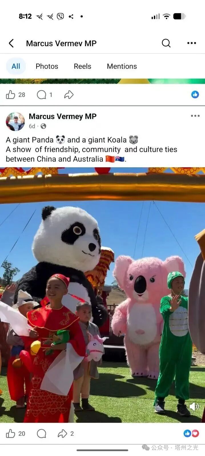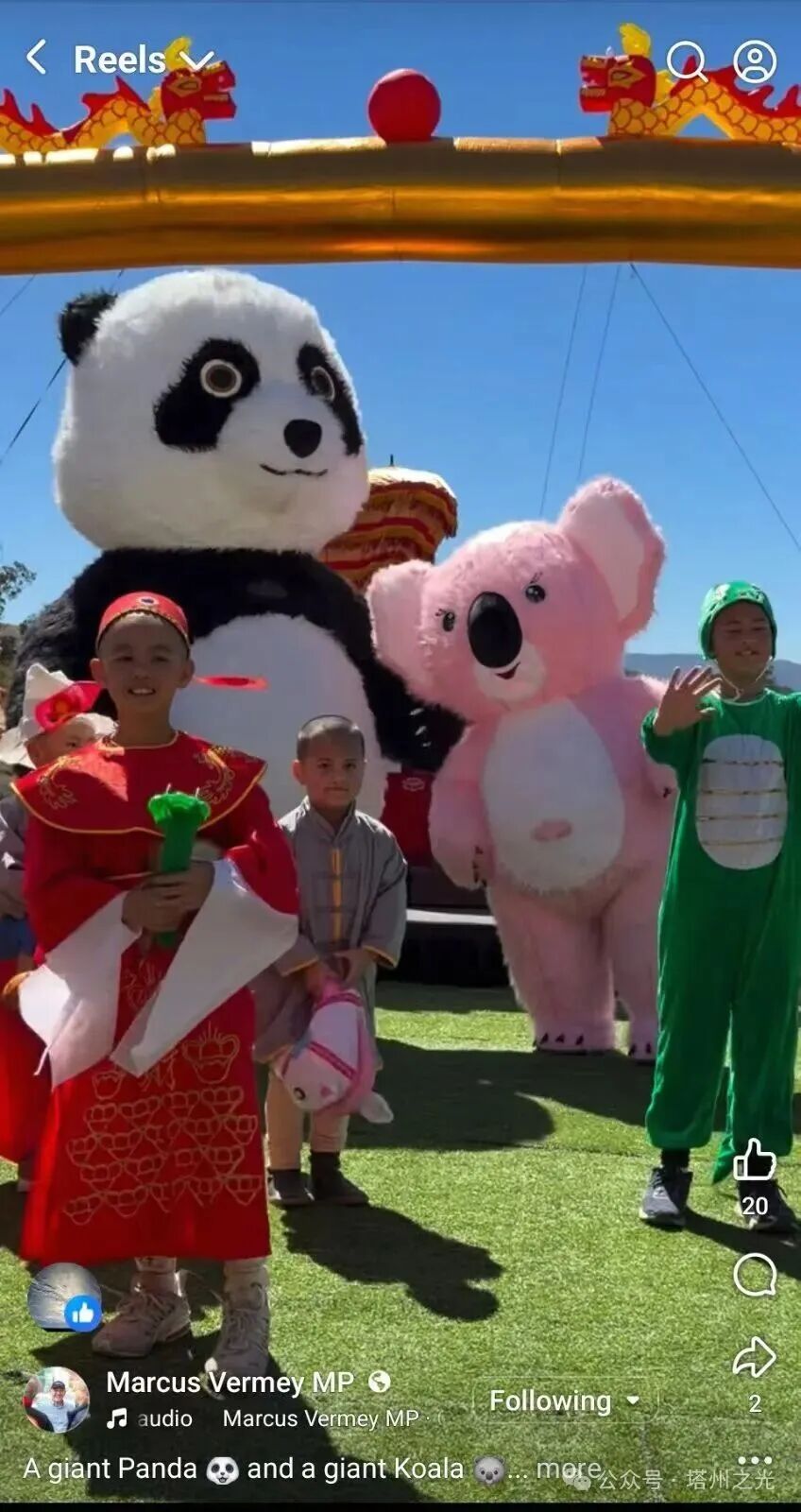 州長代表Marcus Verney MP 臉書:一隻大熊貓和一隻大考拉象徵著中澳兩國友誼、社群與文化紐帶的展現